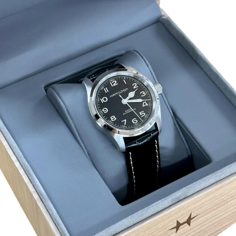 The Khaki Field Murph Auto 38mm is here. One of the science fiction's most famous watches known by fans as 'The Murph' is now housed in a compact 38mm stainless steel case. Featuring ultra-readable black dial, beige vintage-style Super-LumiNova® finished hands and black leather strap, it reflects the key aesthetic codes of its 42mm predecessor. Powered by the H-10 automatic movement boasting an 80-hour power reserve, this Khaki Field Murph Auto will capture the hearts of those who are in love with smaller watches.